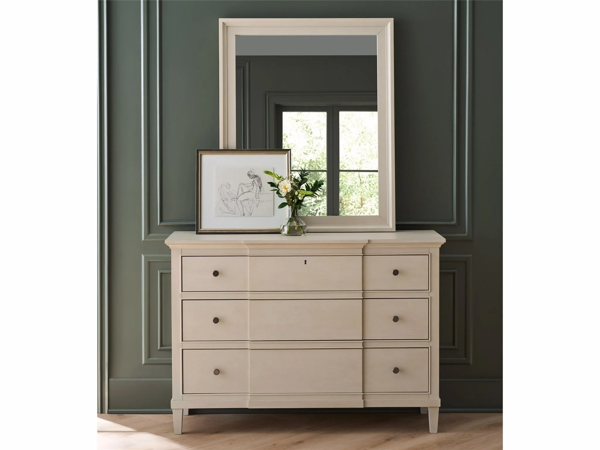 moreThe Willow Dresser is a beautifully tailored storage piece, presenting a lighter-scale option in the serene Willow finish. All drawers are secured with soft-close guides, while the bottom row is lined in cedar for superior preservation of clothing.