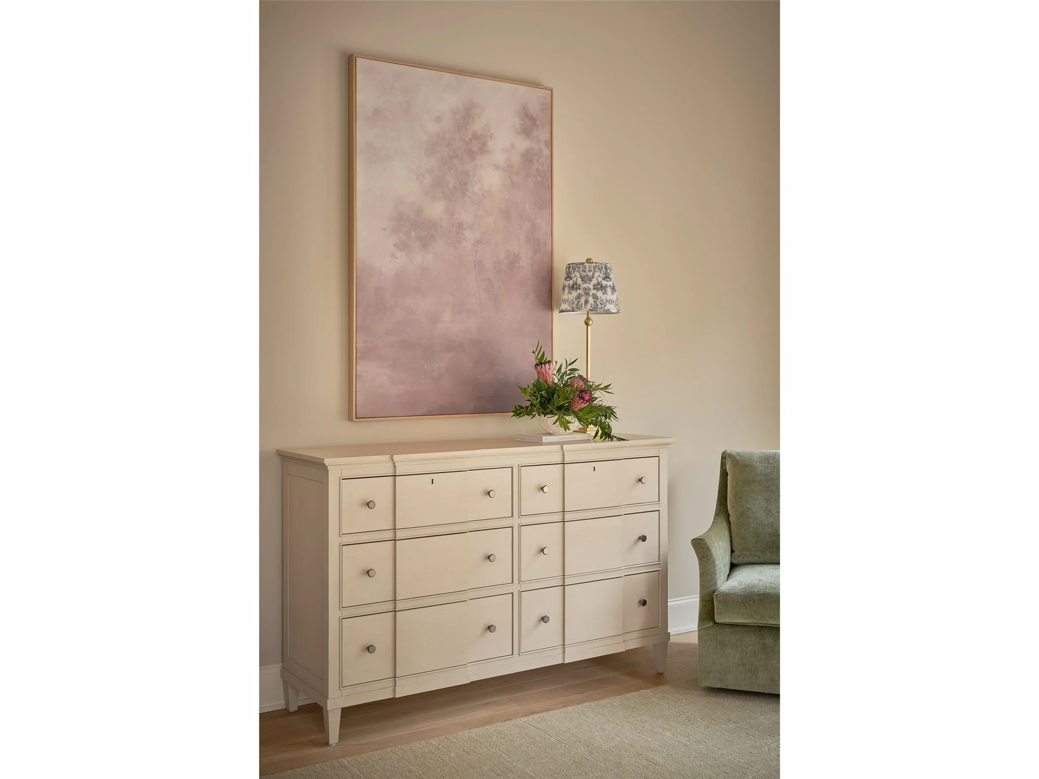 The Willow Dresser is a sophisticated centerpiece, showcasing clean lines and fine grain in the light, elegant Willow finish. Thoughtful details include smooth-operating soft-close guides and cedar-lined bottom drawers, ensuring both luxury and lasting utility.